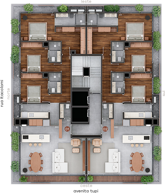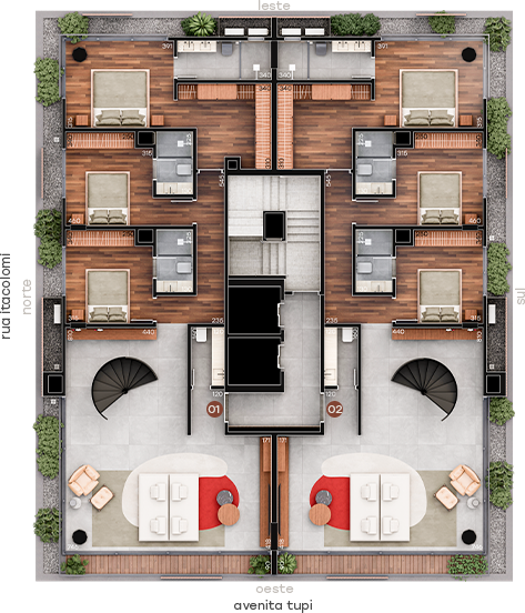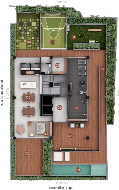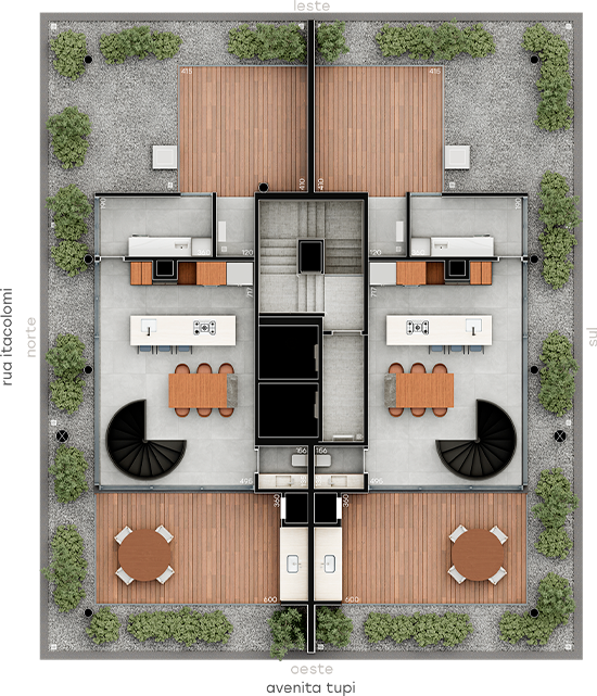 E, por fim criamos espaços verdes com paisagismo inspirado na biodiversidade local.